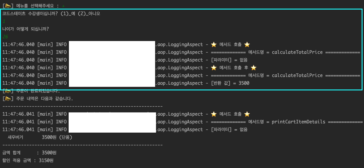- 주문하기를 누르고 수강생인지 확인하는 것과 나이를 확인하는 부분에서 checkAllDiscountConditions() 메서드가 호출되면서 로깅 기록이 남아야 하는데 누락되었다.