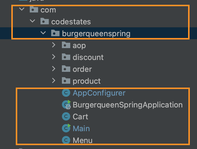 즉, com.codestates 의 직계 하위 패키지는 burgerqueenspring 이고 그 안에 Discount 나 Order 클래스를 찾아야하는데 클래스가 존재하지 않으니 당연히 로그 기록이 찍힐 수가 없었다.
