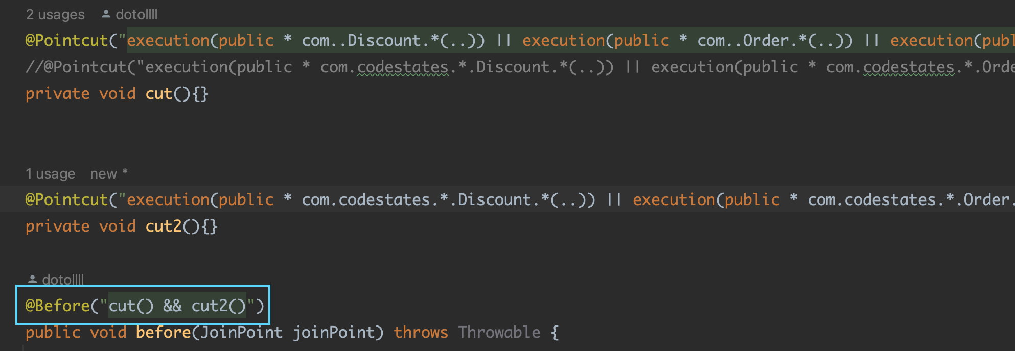 @Pointcut("execution(public * com.codestates.*.Discount.*(..)) || execution(public * com.codestates.*.Order.*(..)) || execution(public * com.codestates.*.Cart.*(..)) || execution(public * com.codestates.*.Menu.*(..))")