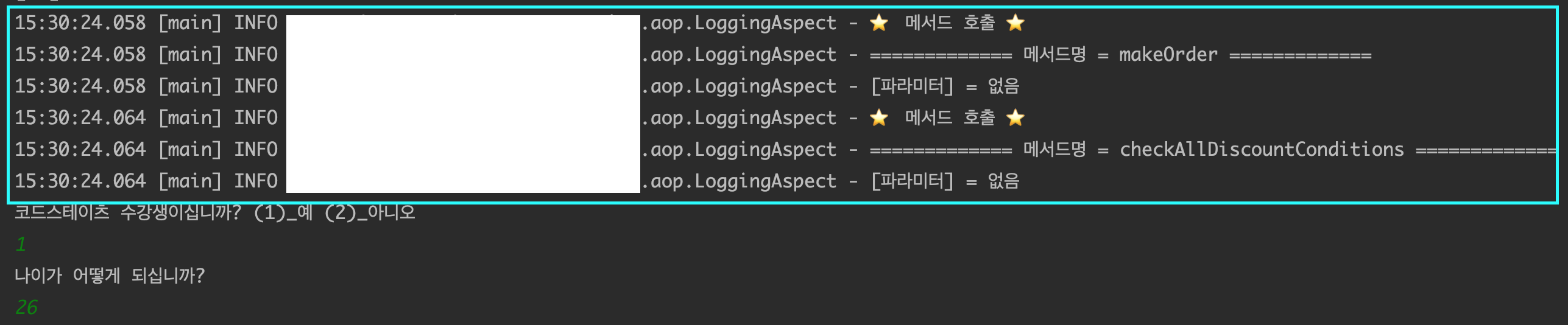 Aspect 클래스를 작성하고 실행시키니 메서드 호출이 아래와 같이 잘 되는 것을 확인 할 수 있었다. 하지만 Discount 클래스의 메서드와 Order 클래스의 메서드에서 로깅 기록이 남지 않는 것을 발견했다.