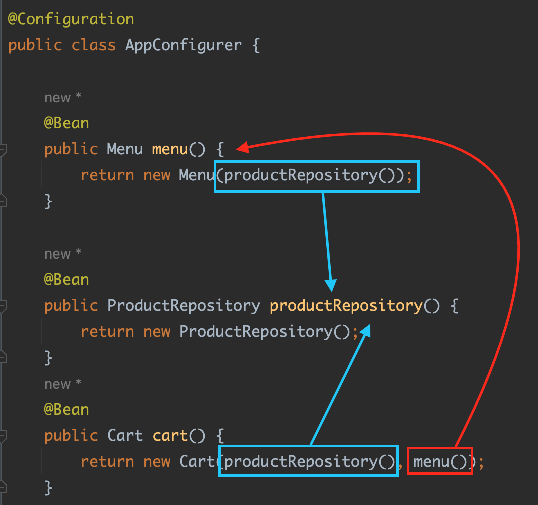 - @Bean 애너테이션이 붙어있는 menu()라는 이름의 메서드의 호출 결과로 반환된 new Menu(productRepository()) 객체 빈은 menu 라는 이름으로 스프링 컨테이너의 빈 리스트에 저장된다.
