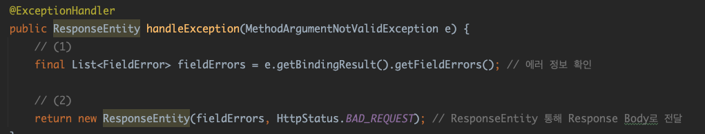 - 4번을 통해 얻은 에러 정보를 ResposeEntity를 통해 Response Body로 전달함
