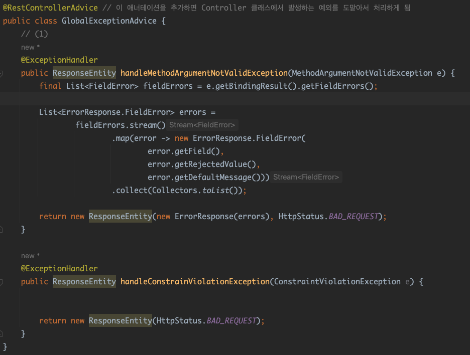 ➡️ 특정 클래스에 @RestControllerAdvice 애너테이션을 추가하면 여러 개의 Controller 클래스에서 @ExceptionHandler, @InitBinder, @ModerAttribute가 추가된 메서드를 공유해서 사용할 수 있음