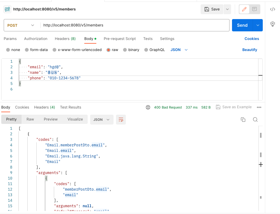 - 유효성 검증에 실패한 필드가 두 개이기 때문에 에러 정보 역시 두 개로 나오는 것을 알 수 있음