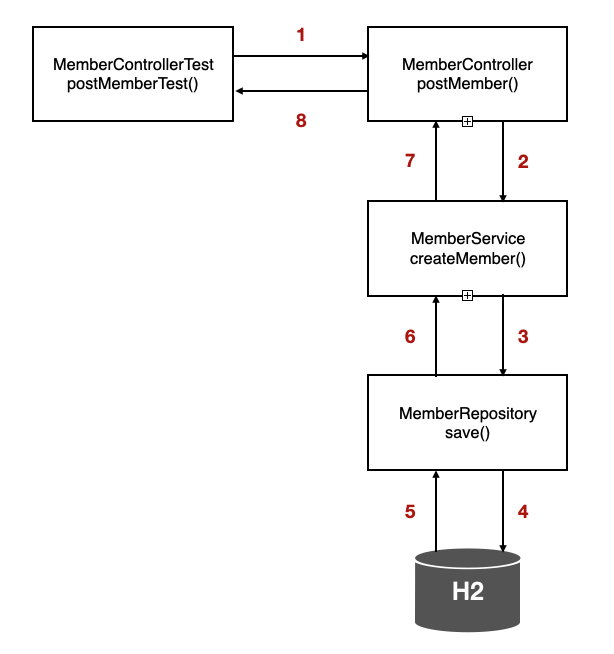 - MemberControllerTest의 postMemberTest() 실행 시 테스트 실행 흐름은 아래와 같음