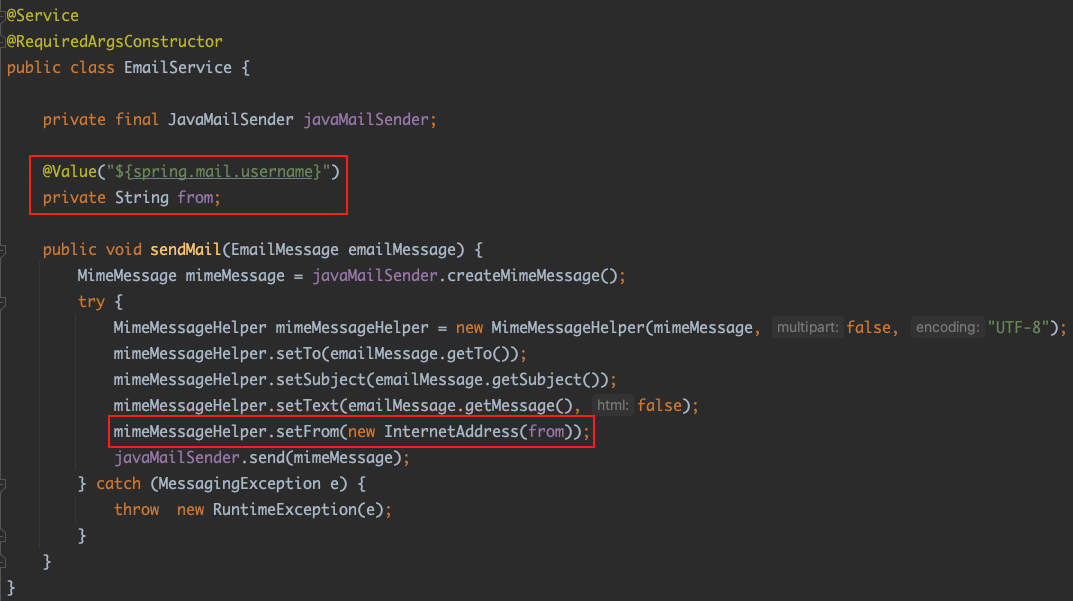 즉 InternetAddress 클래스는 이메일 주소 형식의 문자열을 받아서 이메일 주소 객체로 만들어주는 역할을 하는 클래스인데 나는 from으로 아이디만 덜렁 넣어줬으니 이메일 주소 형식에 일치할 리가 없었다. yml 설정 형식 자체가 username 만 적어주는 식이라서 나는 그냥 아래와 같이 문자열로 이메일 주소를 추가해주었다.