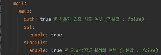 실제로 spring.mail. 이런 식으로 시작되어야 맞는 것인데 내가 띄어쓰기를 하지 않고 딱 붙여 썼으니 yml에 작성한 SMTP에 대한 설정이 인식이 안 됐던 것이다. 그래서 빈을 자꾸 찾을 수 없다고 에러가 났다. 찾고 나니 굉장히 허무했지만 엄격한 yml 파일의 문법에 대해 다시 생각해 볼 수 있는 시간이 됐다고 긍정적으로 생각하기로 했다. 좀 더 머릿속으로 정리 되기도 했고... 다음에는 더 꼼꼼하게 봐야겠다.