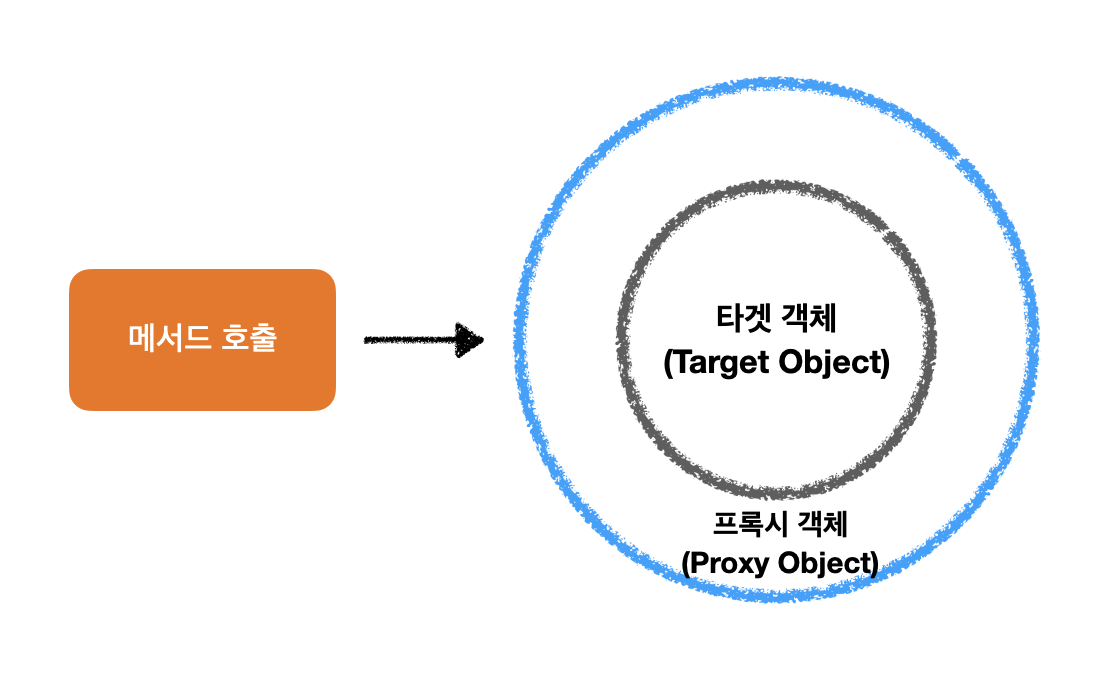 ➡️ 위 그림과 같이 타켓 객체를 프록시 객체가 한번 감싸는 구조를 가짐