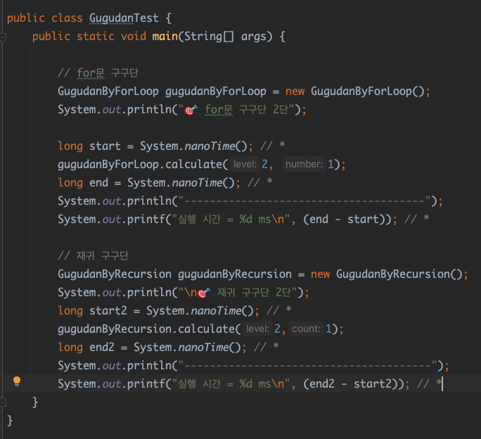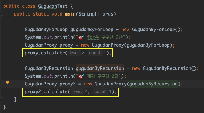 ➡️ 즉 GugudanProxy 클래스는 실행 시간 측정이라는 공통 사항 로직에 집중하고 GugudanByForLoop 클래스와 GugudanByRecursion 클래스에서 구구단 계산에 대한 핵심 기능을 담당하여 역할을 분리 시킴!