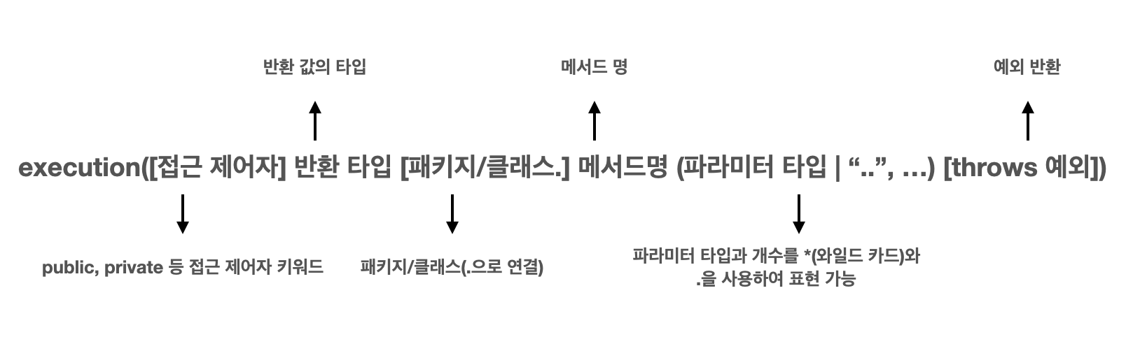 정규 표현식 또는 AspectJ 문법(execution 명시자 표현식)을 통해 정의 가능 - 위빙(weaving)